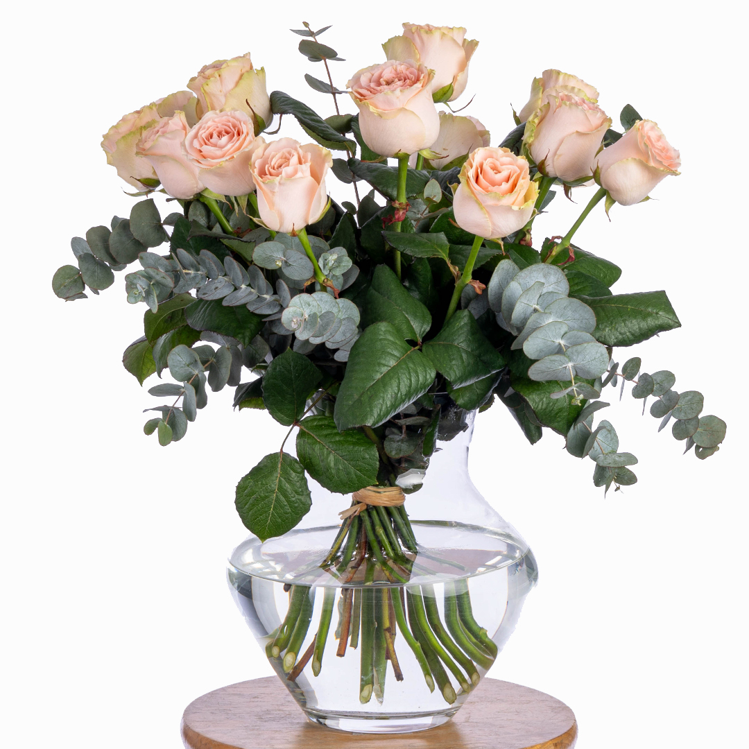 Ce bouquet est composé d’une dizaine de roses roses et de feuillage d’eucalyptus.