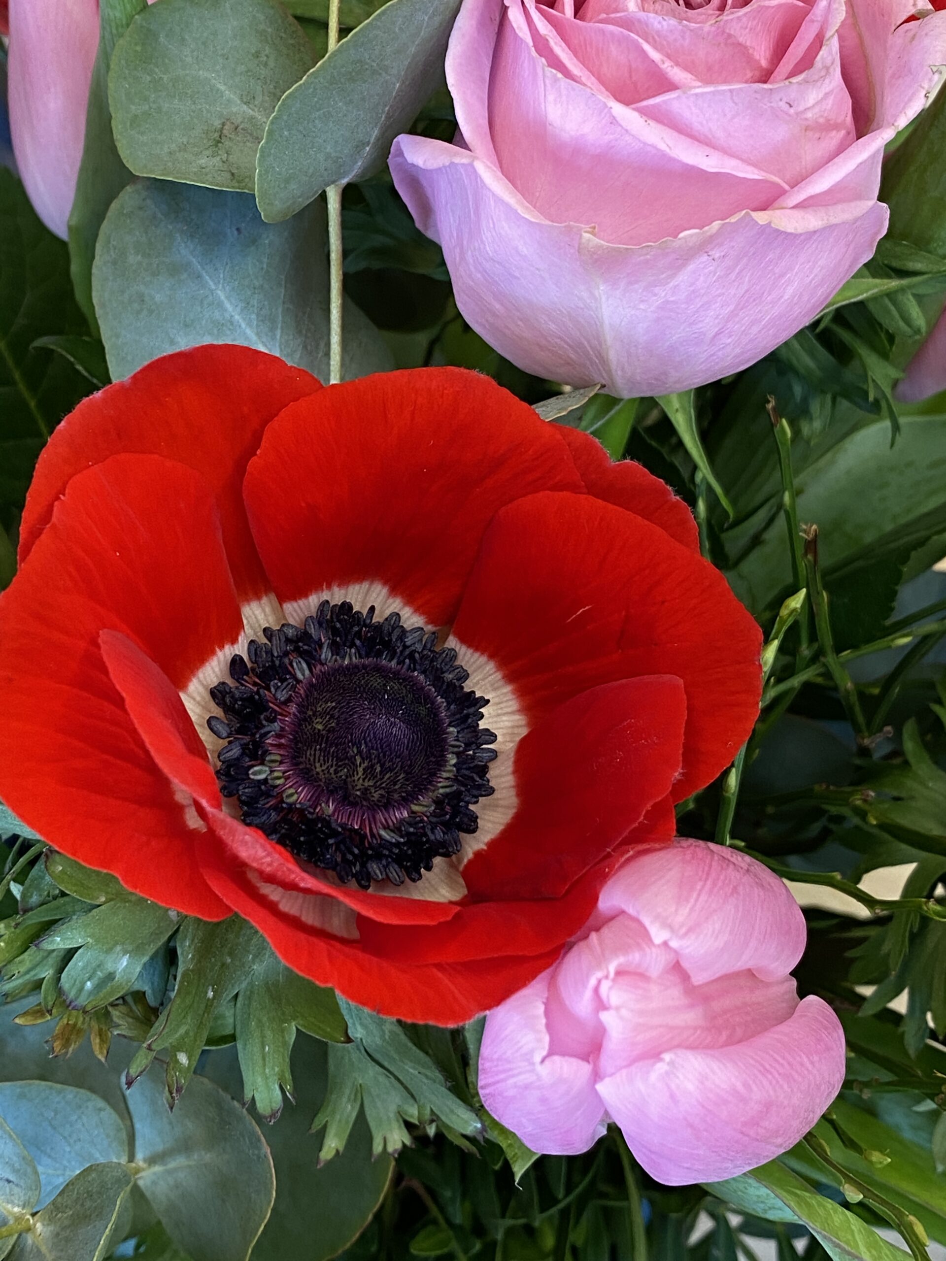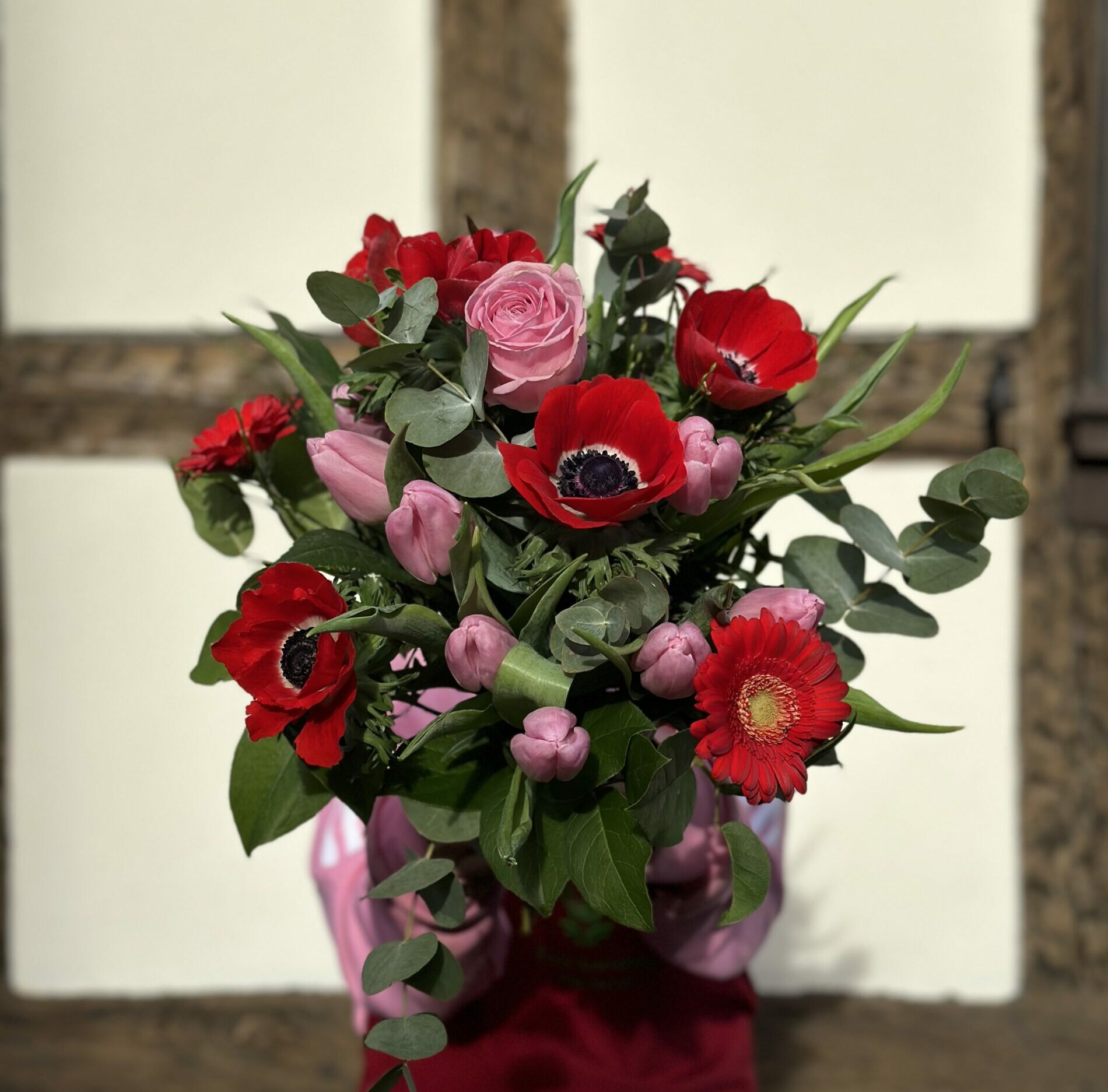 Ce bouquet est composé d’anémones, de tulipes, de gerberas et de roses