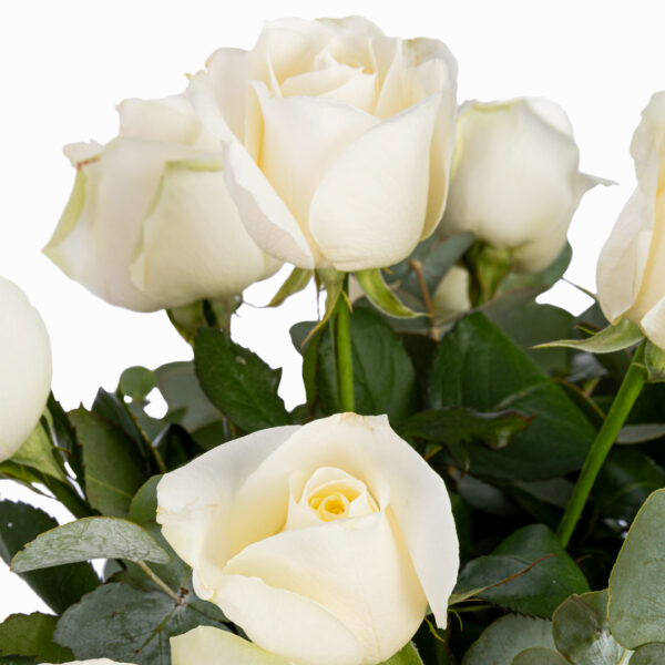 Ce bouquet est composé d’une dizaine de roses blanches et de feuillage d’eucalyptus.
