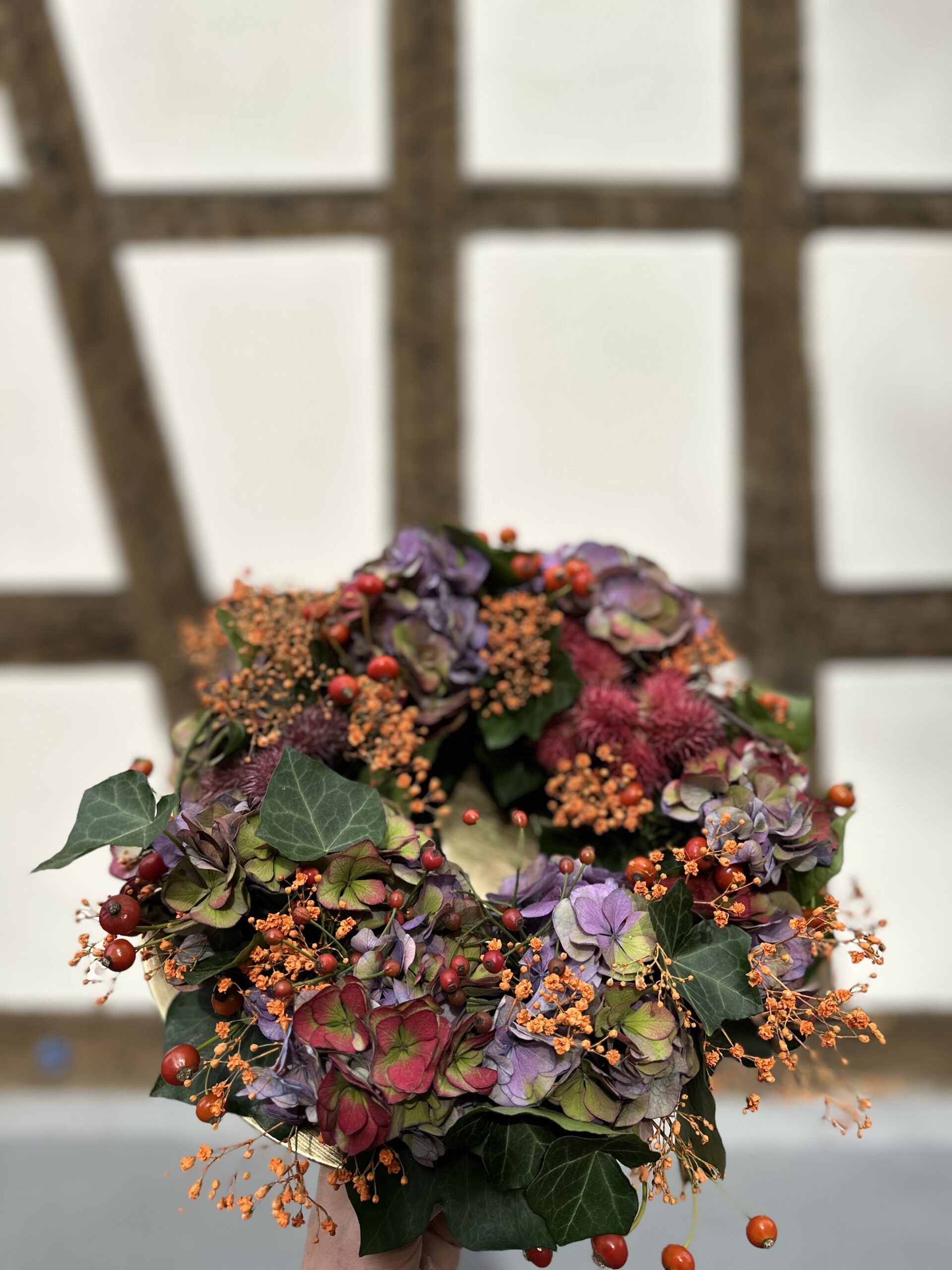 Composées avec des fleurs de saison, la couronne saisonnière ne peut que séduire. Pour la saison automnale nous avons choisi de travailler de l’hortensia, des églantiers, du lierre, des éléments secs ainsi que de nombreux feuillages glanés dans notre jardin. Coloquintes et petites pommes peuvent également venir compléter cette composition qui met en avant la saison des récoltes.