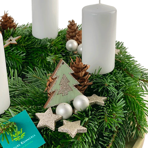 Garnie avec 4 bougies blanches, petits sapins en bois, boules et étoiles – les bougies et décors peuvent varier de couleur sur demande, dans la limite des stocks disponibles et ce afin de garantir le prix.